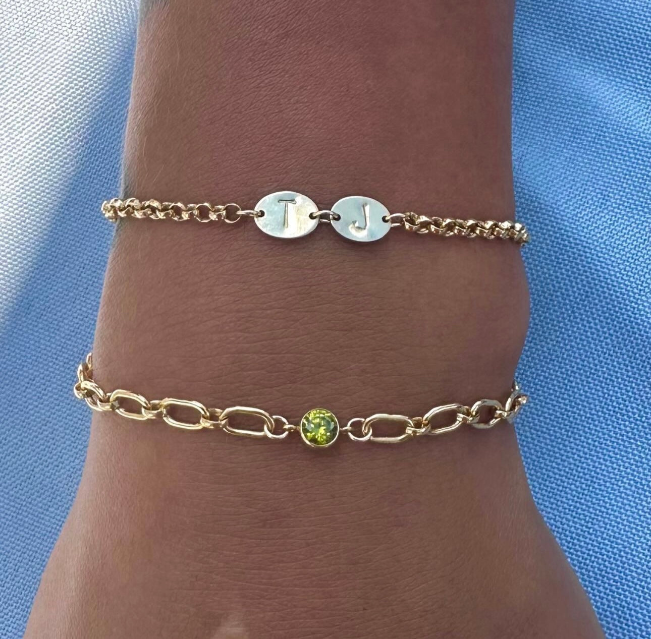 Intial charms on gold filled chain, August birthstone on gold filled chain