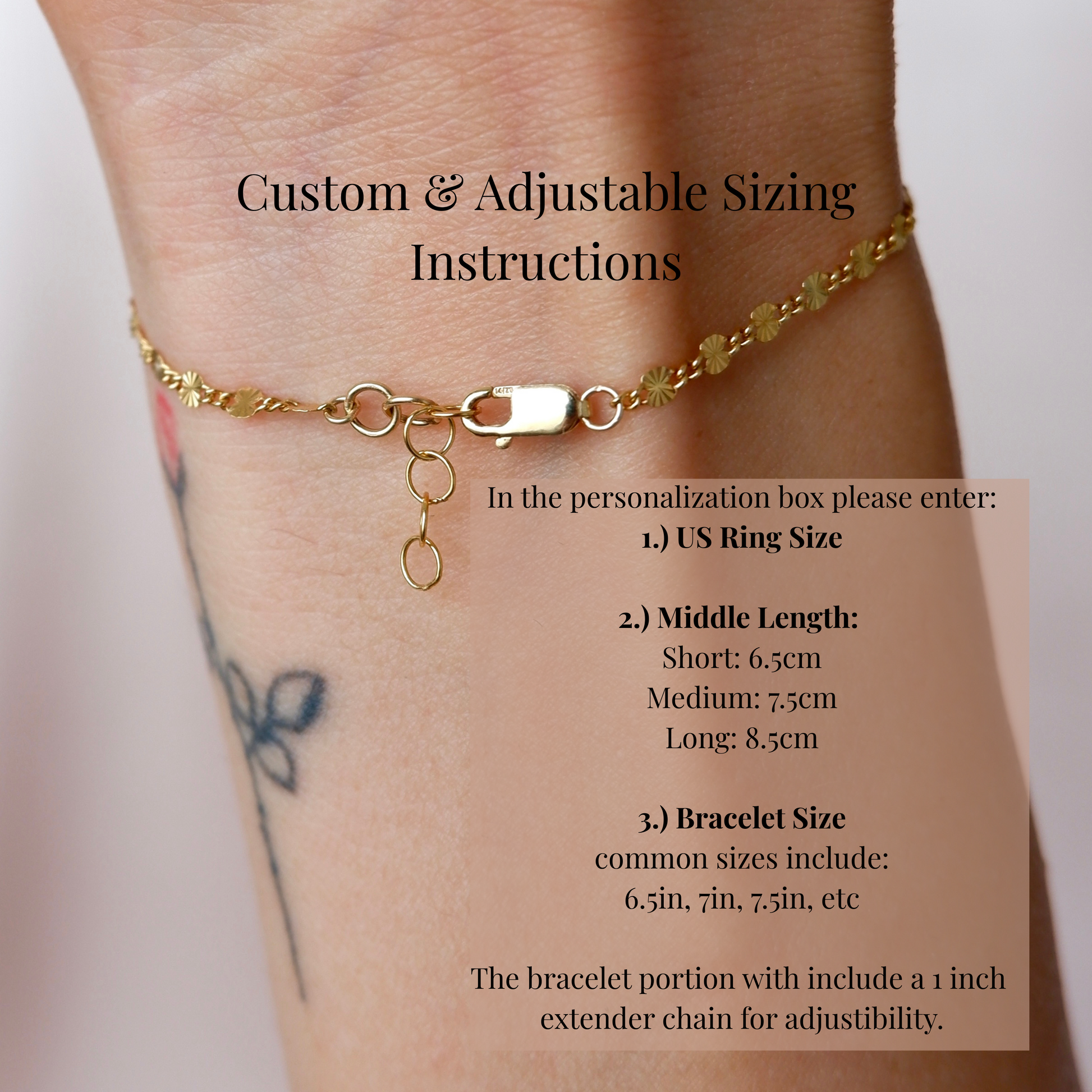 BRACELET: For bracelet sizing I recommend requesting a size that is at least 0.5 inches larger than your wrist measurement for a comfortable fit. The hand chain also includes a 1 inch extender chain. If you would not like an extender chain please mention that in the personalization box.