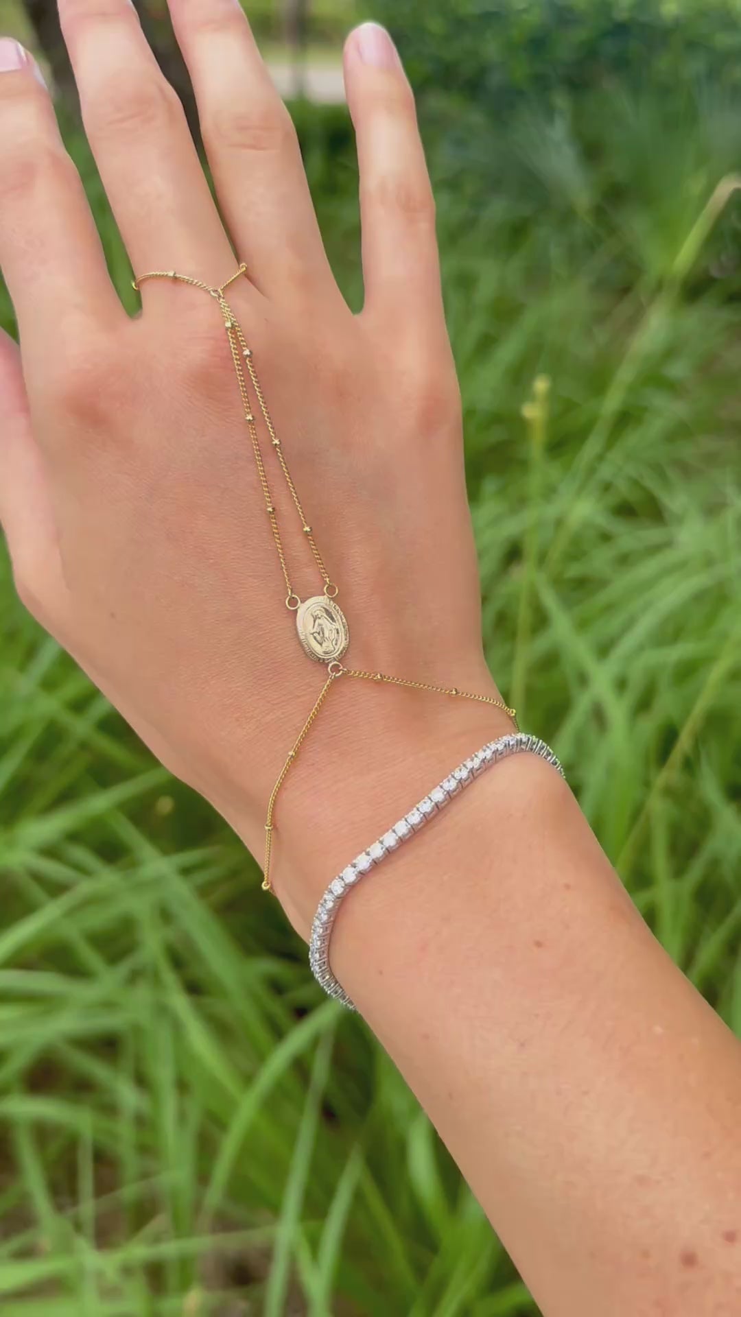 This hand chain was designed and is handmade by me, Elaina. All elements of the hand chain are 14K gold filled material. This rosary inspired hand chain is dainty yet durable and is very comfortable to wear on a daily basis.