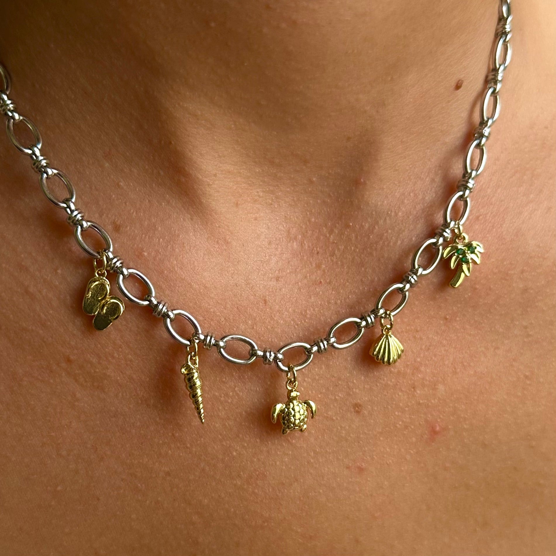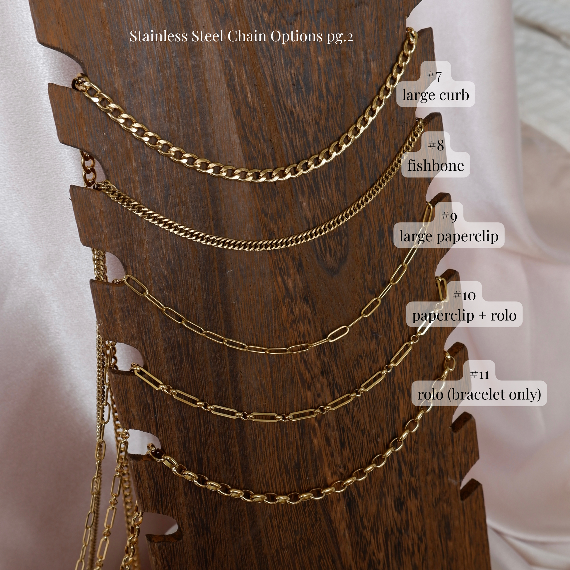 All of the chains are made from stainless steel. The charms are gold or silver plated over brass.