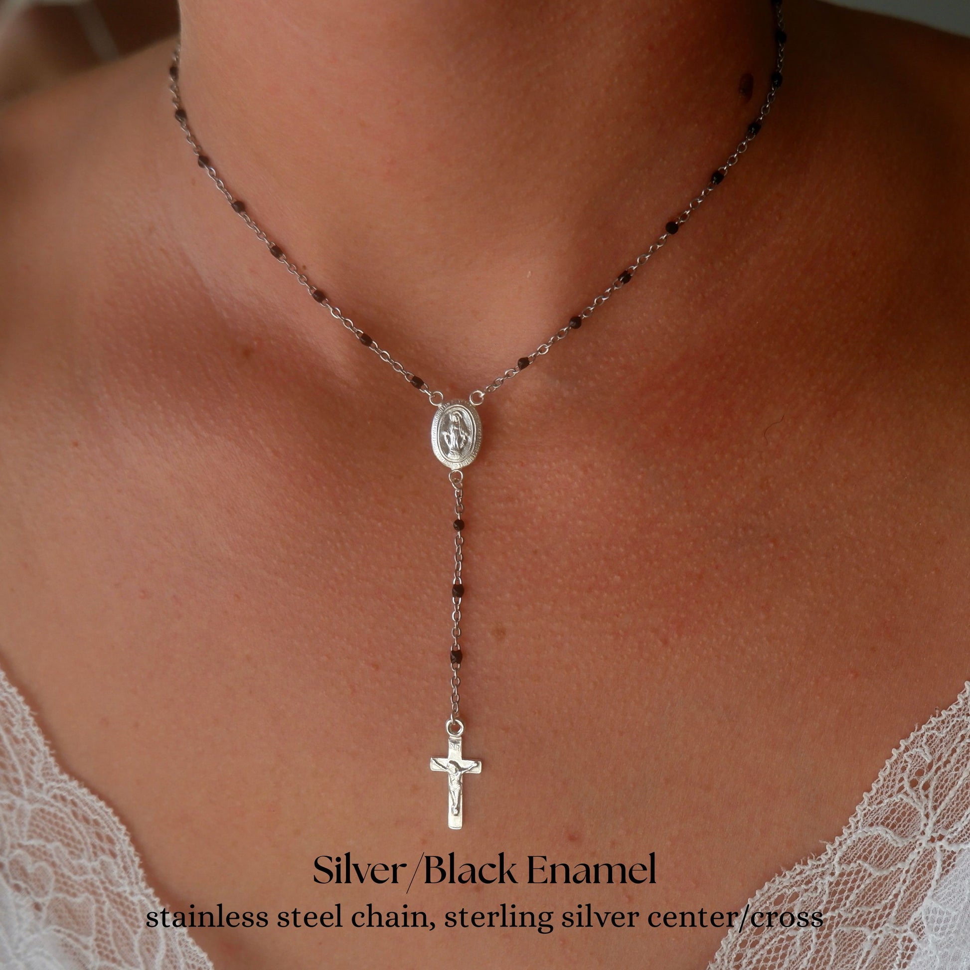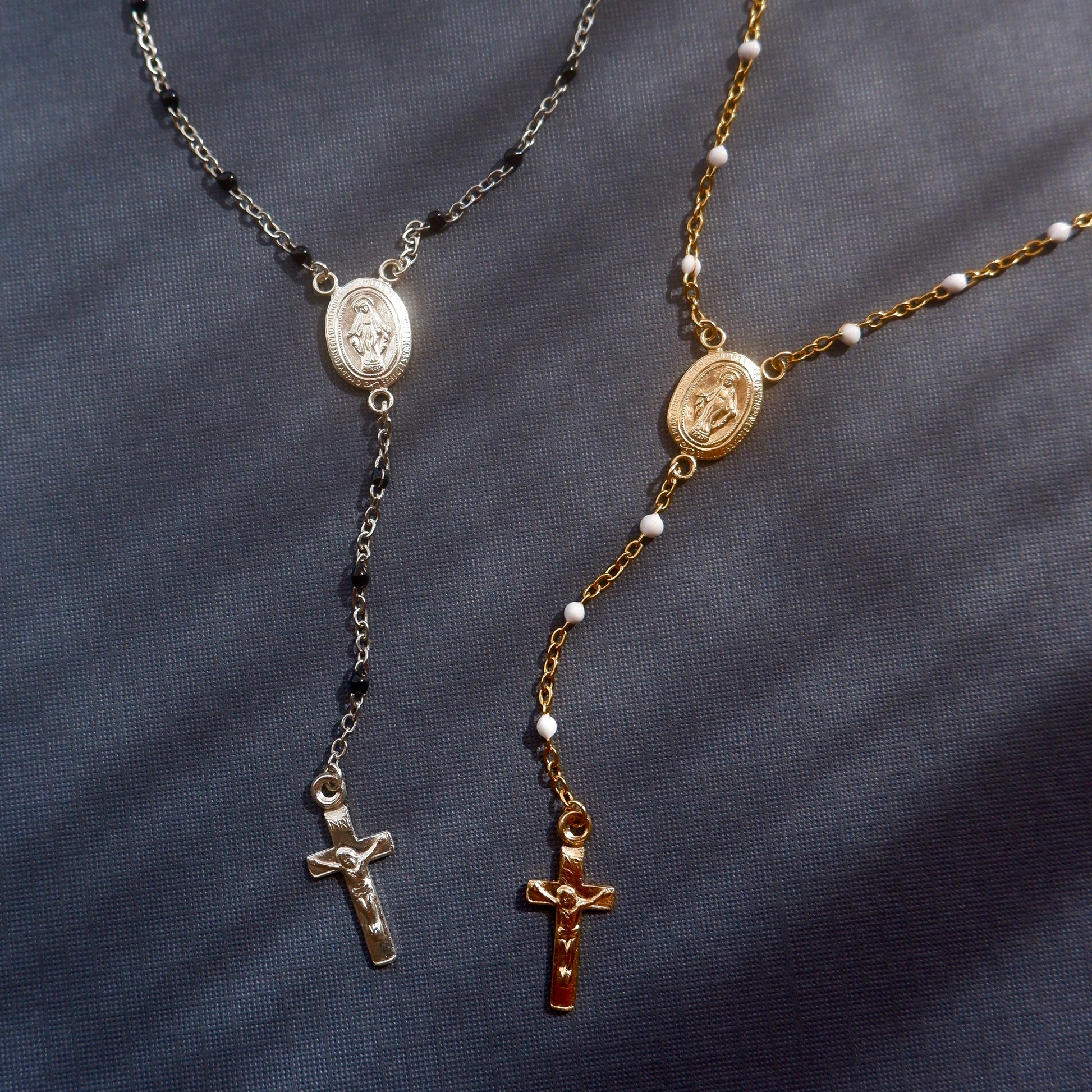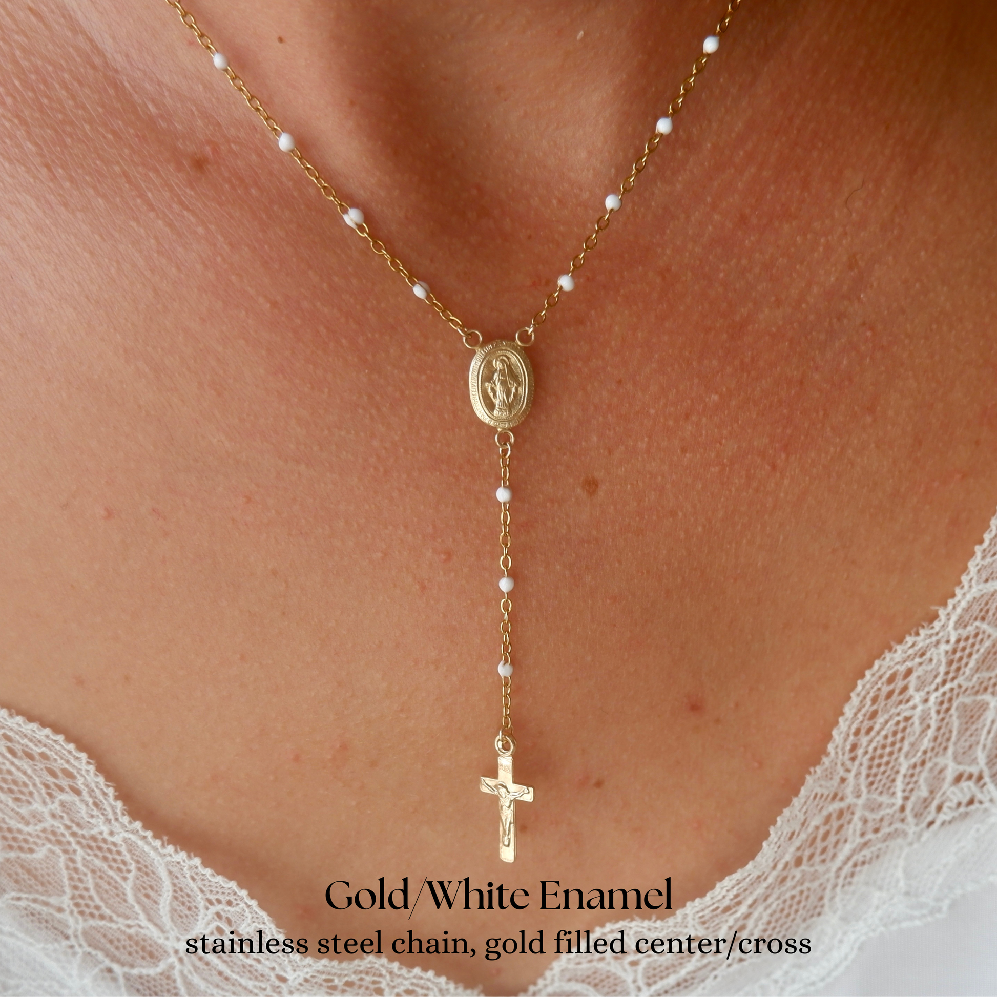 These rosary-inspired necklaces are hand made by me, Elaina. The necklaces are 15 inches in length and include an extender chain for adjustability up to 17 inches. If you would like to request a custom length please type it in the personalization box before adding the necklace to your cart.