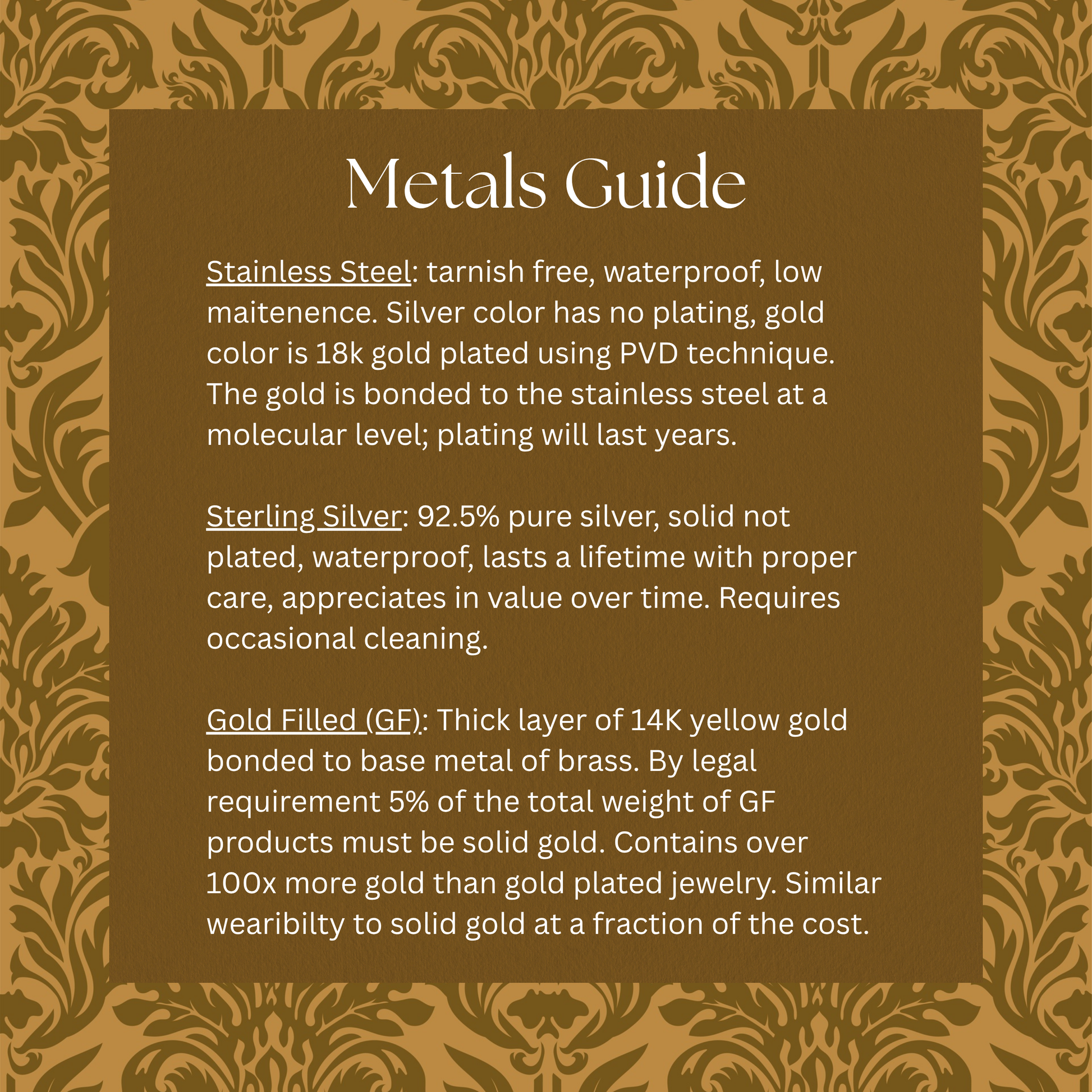 Please refer to the metals guide on listing photo #10 to learn about the materials used in each necklace style. If you have any questions about materials, care, or storage please message me, I would be happy to help.
